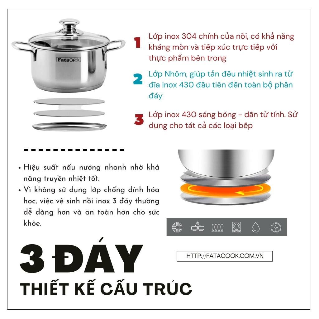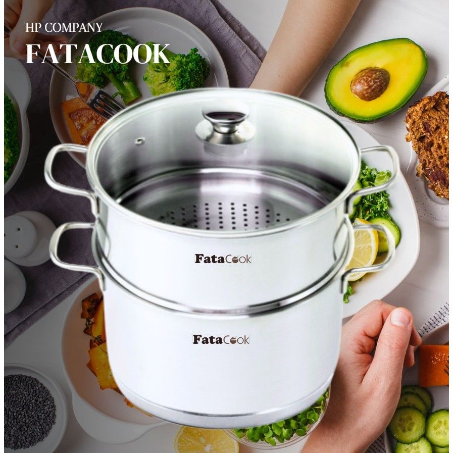- Bộ nồi và xửng hấp inox 3 đáy FataCook có thiết kế tinh tế, hiện đại, phù hợp với mọi không gian bếp. Chất liệu inox sáng bóng, không chỉ tăng tính thẩm mỹ mà còn dễ dàng vệ sinh. Đặc biệt, thiết kế 3 đáy dày giúp phân phối nhiệt đều và giữ nhiệt tốt, đảm bảo món ăn chín đều và giữ nguyên hương vị.